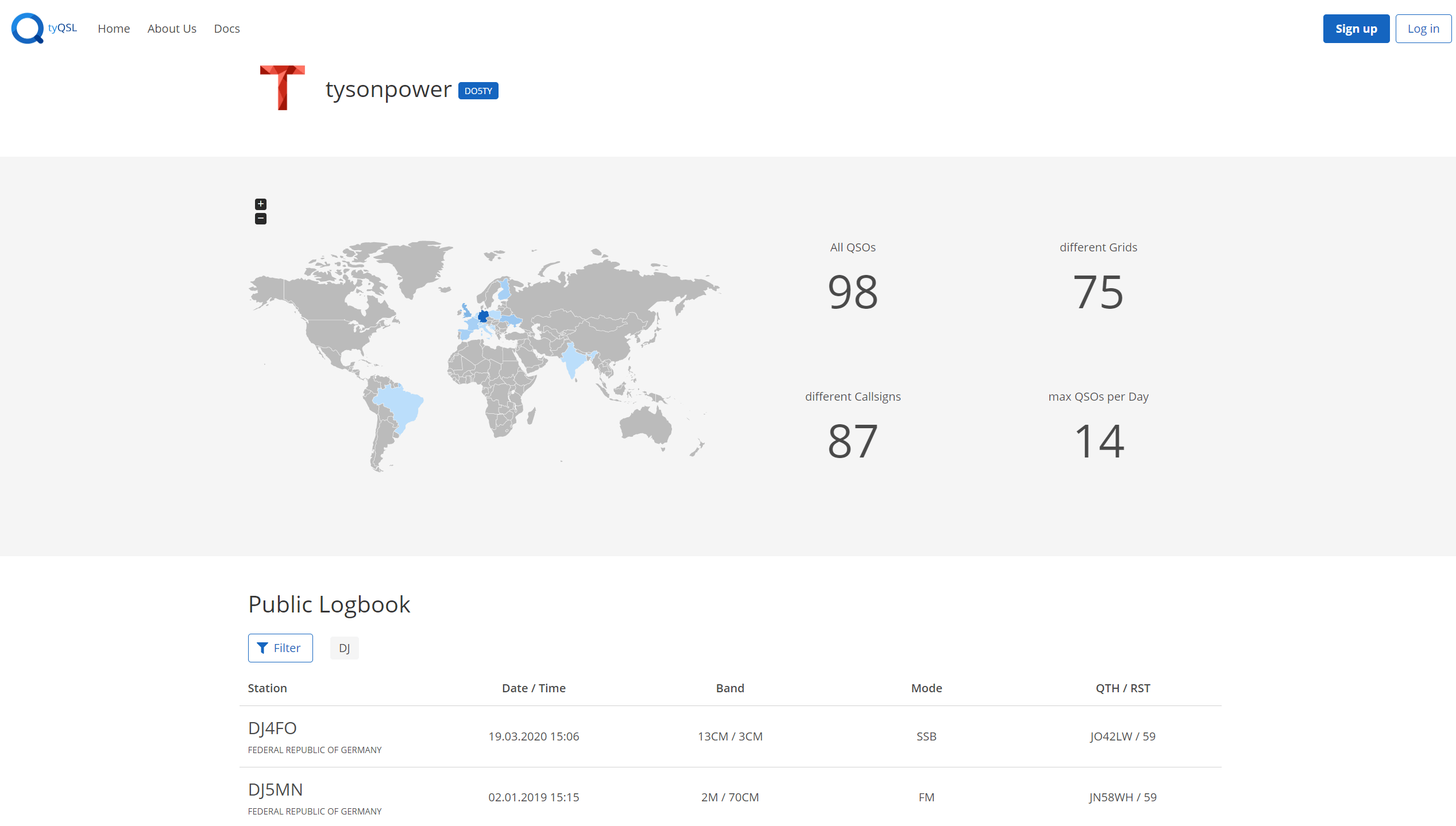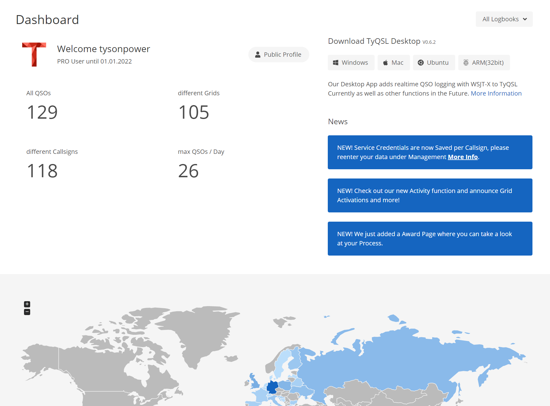 A Place for other hams to take a look at your QSO Statistics as well as search for QSOs in your Logbook that you made public. Just click onto your name in the Menu Bar when you are logged in to get to your public profile.